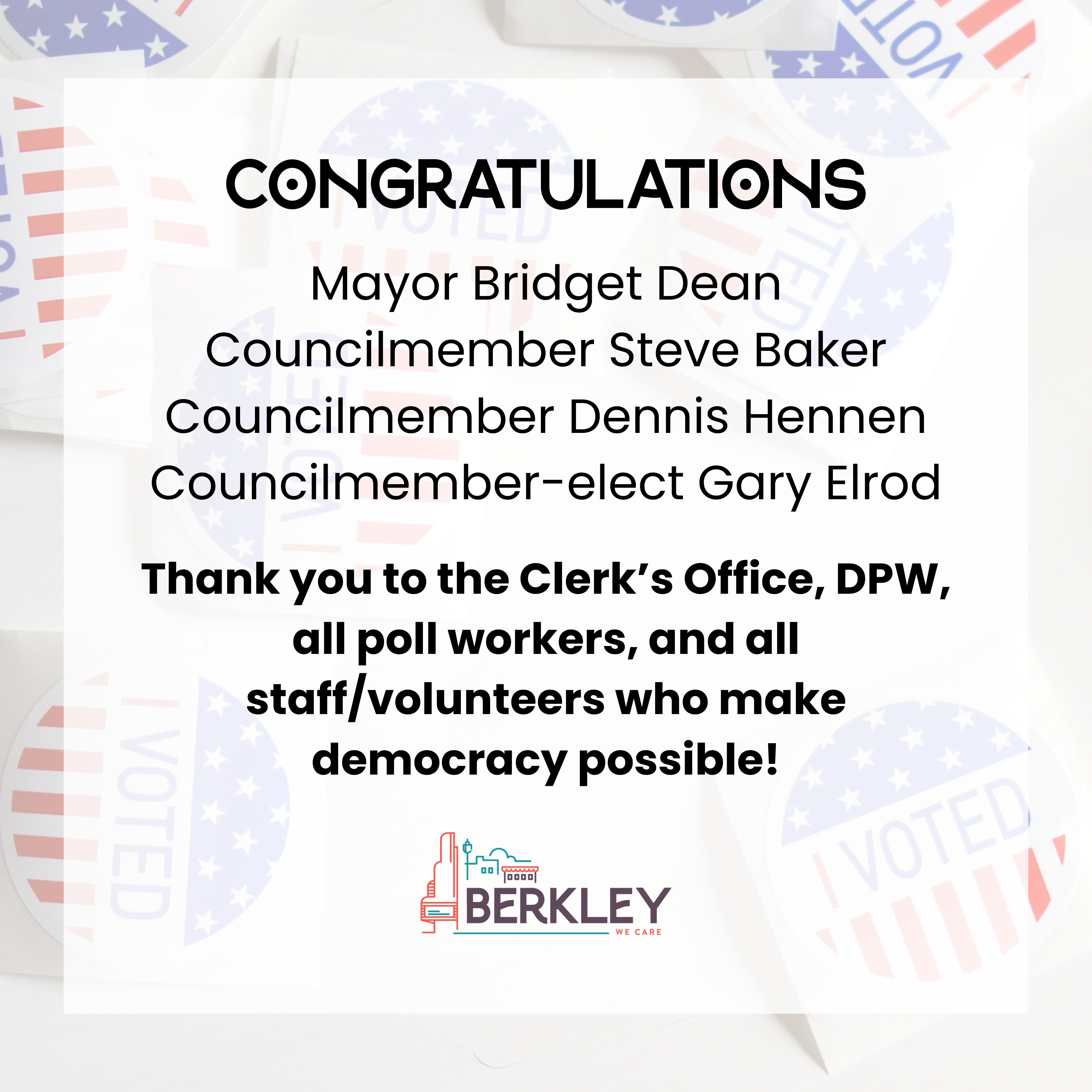 Congratulations to Mayor Bridget Dean, Councilmember Steve Baker, and Councilmember Dennis Hennen on their re-elections to Council, and to Councilmember-elect Gary Elrod on his election. The 41st City Council of the City of Berkley will meet for the first time on November 17. Thank you to all voters, and to our Clerk's Office, DPW, poll workers, and all staff/volunteers whose dedication makes democracy possible!