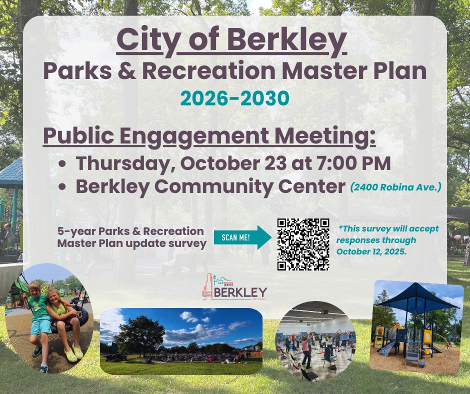 Our 5-year Parks & Recreation Master Plan is in the midst of an update, and we want to hear from you! Please join us for our next public engagement meeting at 7 PM on October 23 at the Berkley Community Center. A short survey is also available by clicking the button below. Please take a few moments to fill it out and share what you would like to see in terms of programming, recreation activities, and more. Responses will be accepted until October 12, 2025. Questions about this process? Reach out to the department at 248-658-3470!