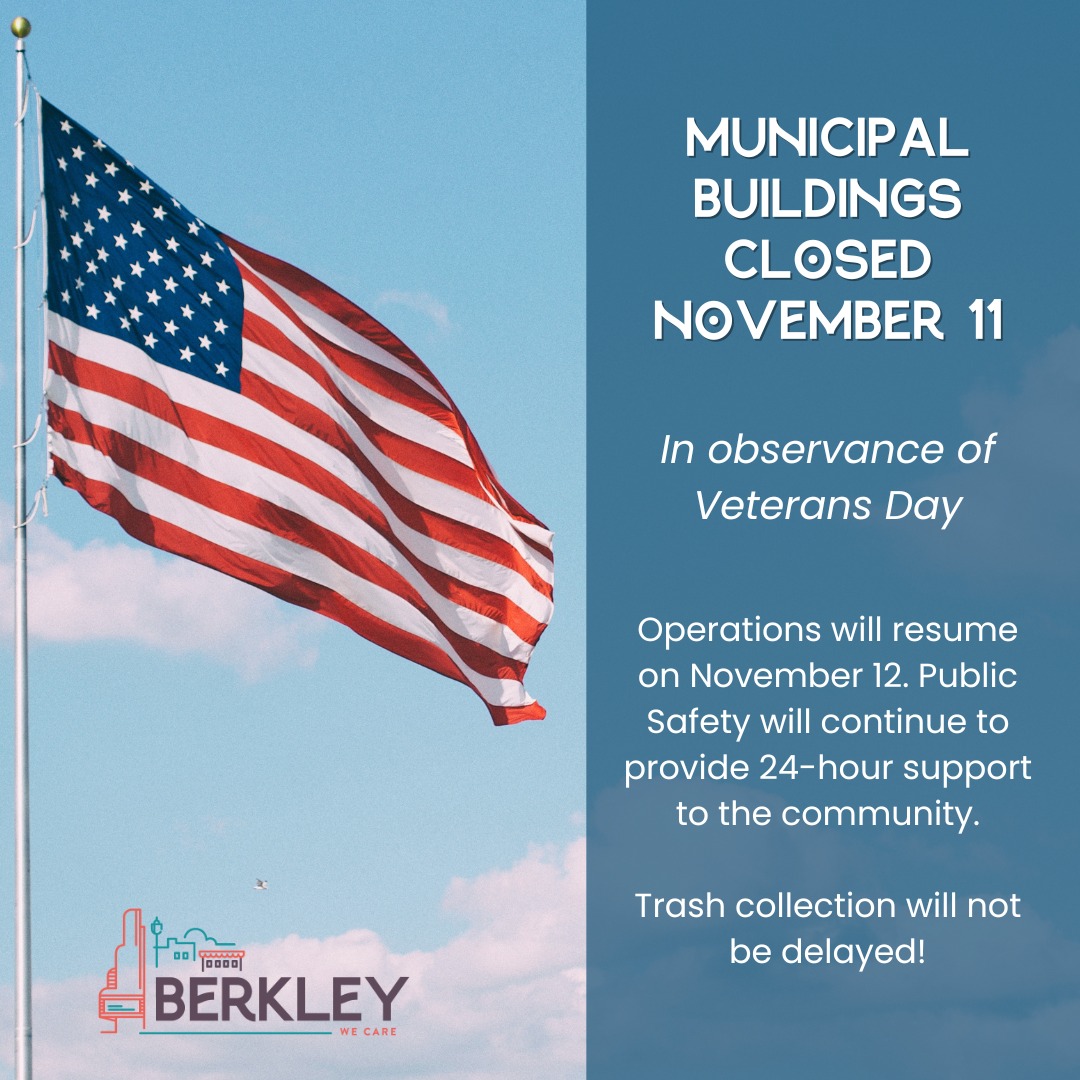 City buildings are closed on Tuesday, November 11, in observance of Veterans Day. Trash collection will not be delayed. Click the button for more information about the Veterans Day Ceremony and lunch event!