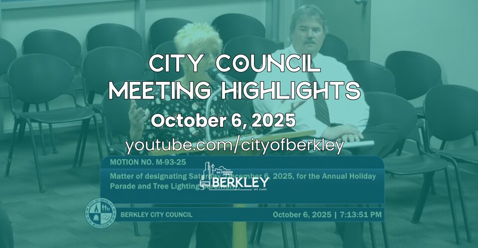 Council approved the 21st annual Berkley Holiday Lights Parade and Tree Lighting Ceremony, scheduled for Saturday, December 6. The Holiday Lights Parade and tree lighting ceremony are organized and funded by community volunteers from the Holiday Lights Committee and the Berkley Junior Women’s Club. More information will be shared closer to the event, and if you’re interested in getting involved, visit their website at berkleyholidayparade.com.